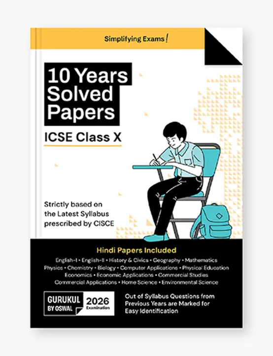 Easy, Quick, and Concise Revision with Gurukul By Oswal 10 Years Solved Papers for ICSE Class 10 Board Examinations 2026. Our Handbook consists of Solved Papers for total 17 Subjects including Hindi, English I, English II, History & Civics, Geography, Mathematics, Physics, Chemistry, Biology, Computer Application, Physical Education, Economics, Economic Applications, Commercial Studies, Commercial Applications, Home Science, and Environmental Science.